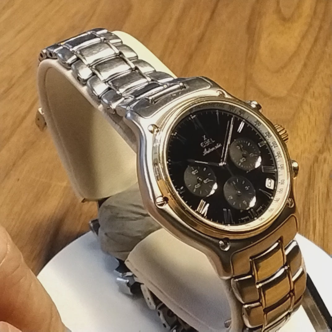 Ebel Automaat zwarte wijzerplaat witte tachymeter rand gouden rand en schroeven kroon ook goud stalen band met gouden lijn